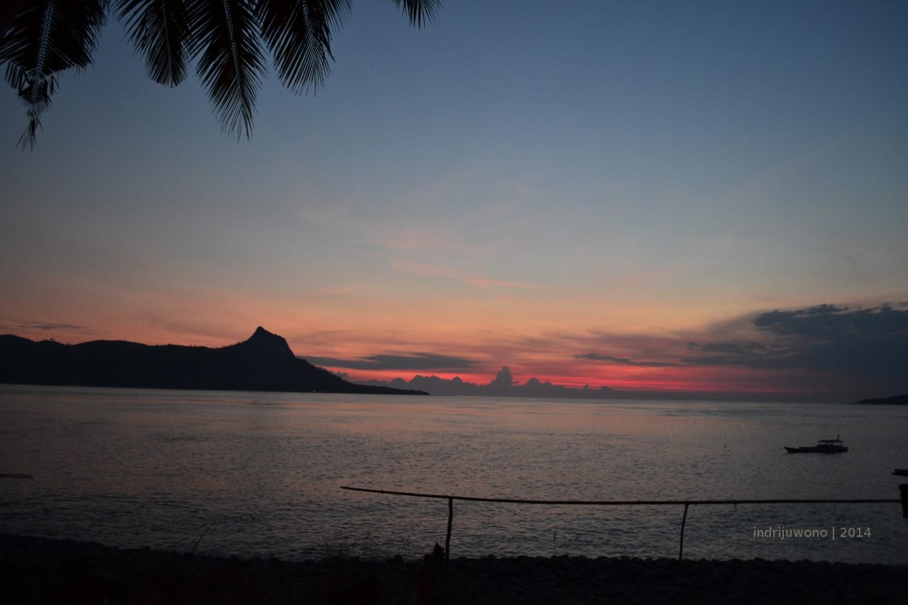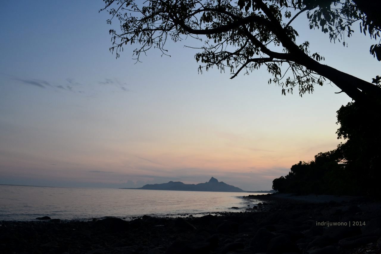 “Nanti makin bagus lihat senja di tepi laut, mbak,” cerita Mas Agus. Hah, laut? Bukannya Wae Rebo di atas gunung? “Dintor itu di tepi laut, baru nanti naik lagi ke atas sampai habis jalan aspalnya,” sambungnya. Aku mengambil peta dan melihat di mana sebenarnya posisi kami. Posisi kami berkedip di GPS memang menunjukkan lokasi menuju tepi laut. Jalan rusak pun sudah tidak kuindahkan, sawah, kebun, hutan, rumah-rumah yang dilewati dengan bau tanah yang harum sesudah hujan membuat kami asyik menikmati pemandangan sore hingga sampai di tepi laut. Tidak ada pasir putih di sini, hanya bebatuan hitam dengan sleret lembayung di belakang dan pulau Mules yang tampak tidak jauh.