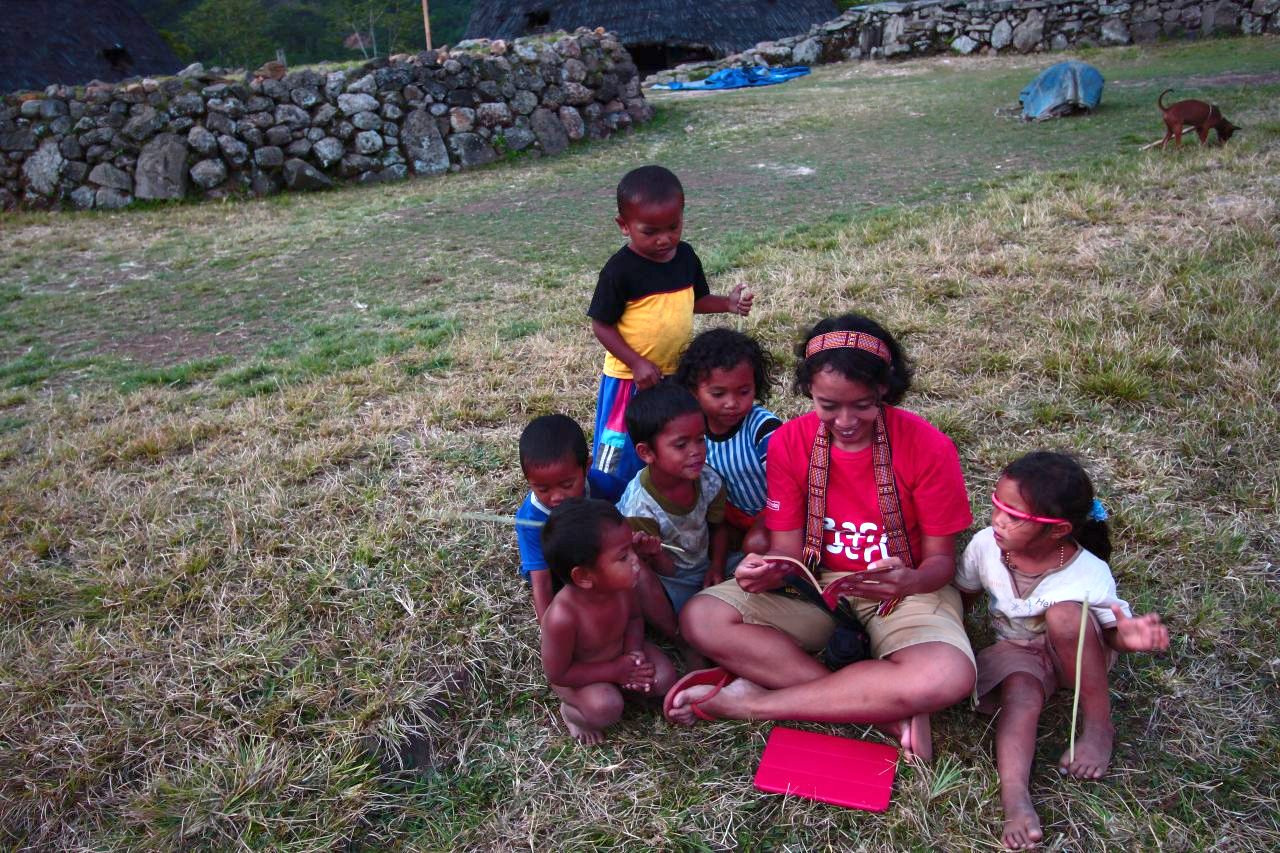Satu-satu mereka memperkenalkan diri. Ada Ronald, Ton, Atris, atau Aten, adiknya Ton yang tidak berbaju, mereka semua merubungiku. Aku membagi-bagikan cup agar-agar dan wafer yang mereka sambut dengan gembira. Seudah itu aku mengeluarkan buku bacaanku untuk diceritakan bersama-sama. Sebenarnya aku agak kecele, karena kukira aku akan banyak bertemu dengan anak-anak usia sekolah di sini. Ternyata begitu memasuki umur 6 tahun mereka dipindahkan ke desa Kombo, yang tak jauh dari Denge, dan pulang seminggu sekali.