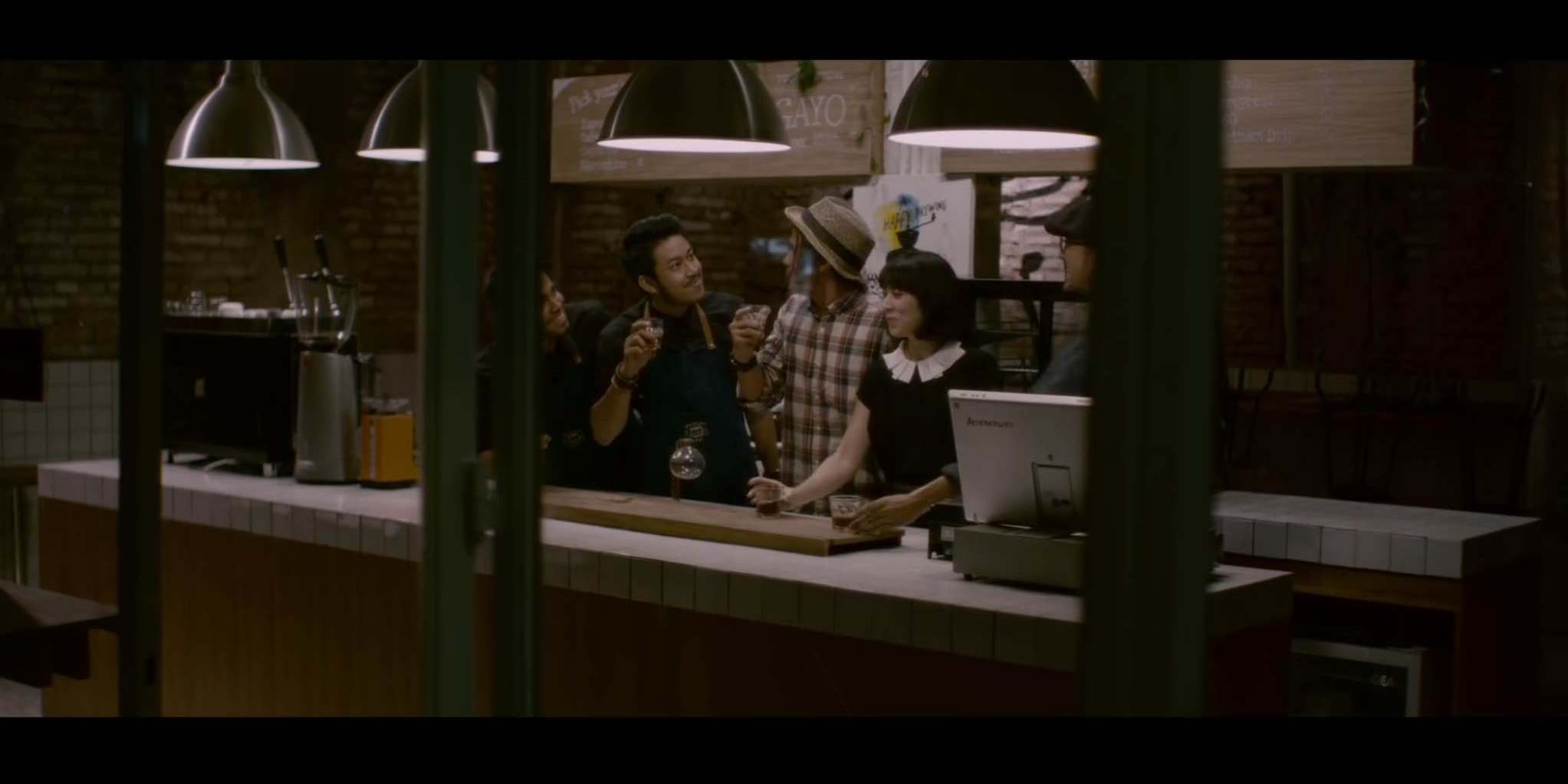 Kedai Filosofi Kopi yang tervisualkan sangat menarik, sebuah toko kelontong tua di kawasan Melawai, di depan lalu lalang yang ramai, tempat orang-orang singgah untuk diskusi atau sekadar chitchat. Ada meja panjang besar sebagai coffee bar sehingga pelanggan bisa langsung melihat bagaimana Ben meracik tiap pesanan untuk mereka. Jarak antara meja-meja dan coffee bar ini juga tidak terlalu lebar, sehingga interaksi antara pelanggan dan barista begitu rekat. Ya, konsep ruang seperti yang ada di kedai-kedai lokal.