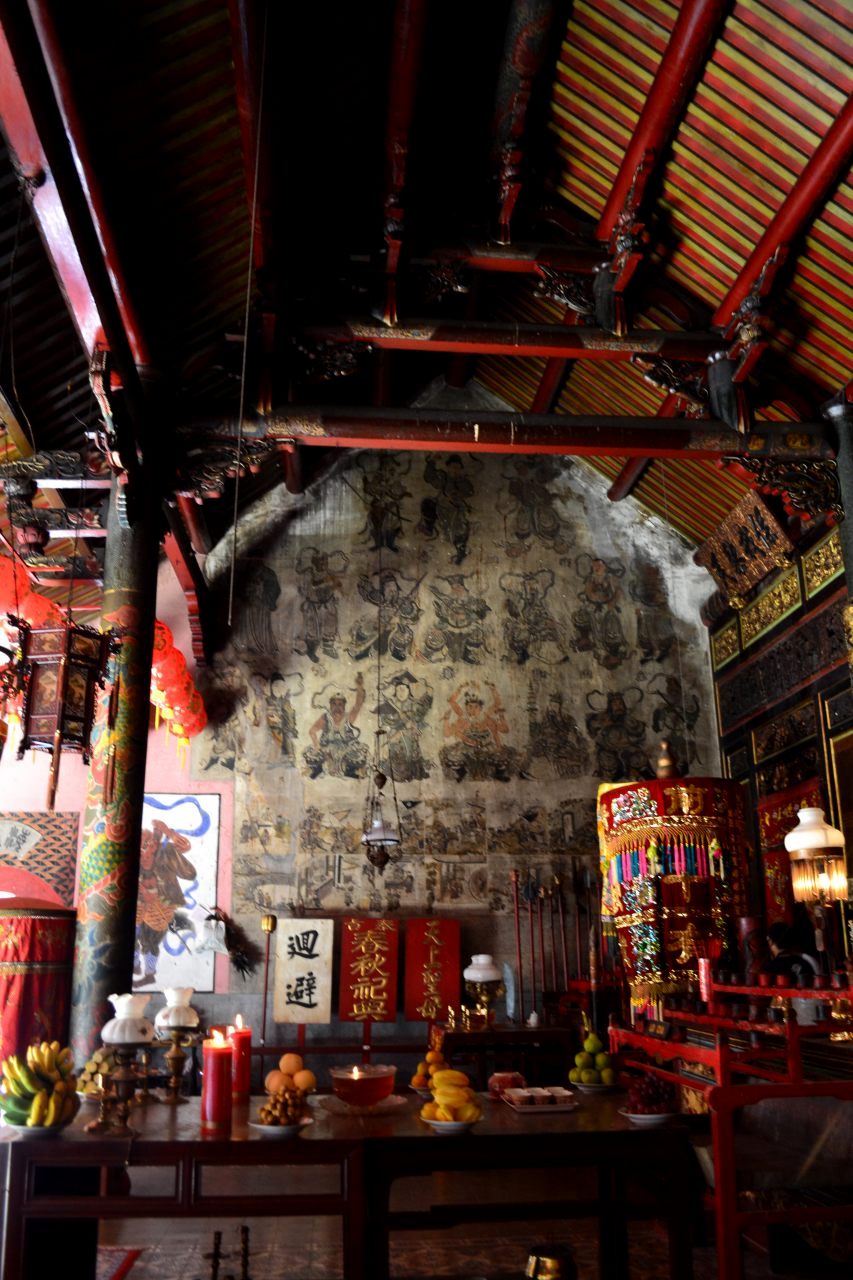 Aku masuk ke bagian dalam lewat pintu yang berada tepat di tengah. Dua pintu di sisi kiri dan kanannya hanya dibuka pada saat-saat tertentu saja. Di bagian dalam kami disambut dengan tegel cap yang indah bermotif di lantai. Suasana di sini tenang sekali. Kulihat tiga ceruk area pemujaan yang tidak boleh dipotret. Juga ada aneka hiasan bernuansa merah juga memenuhi altar utama. Dupa-dupa masih menyala. Hio ditancapkan pada guci. Baunya begitu khas…
