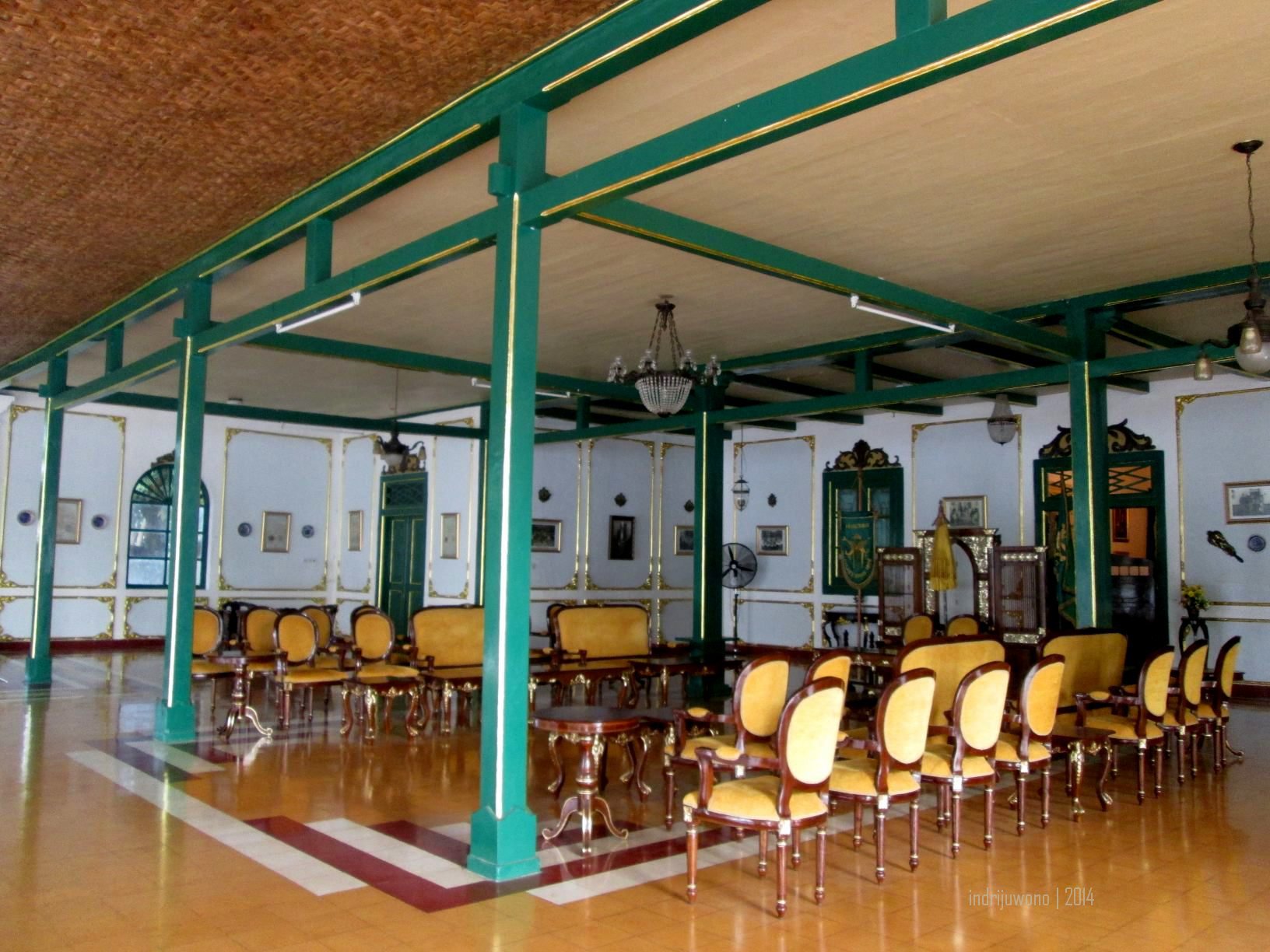 Ternyata, di balik dinding tebal itu terdapat pelataran yang cukup luas, langsung menuju ke bangunan utama keraton, Prabayaksa. Deretan kursi-kursi berwarna kuning keemasan disiapkan untuk menyambut tamu menghadap raja. Ornamen-ornamen cantik di dinding-dinding dicat warna emas, namun warna yang dominan di sini adalah warna hijau.
