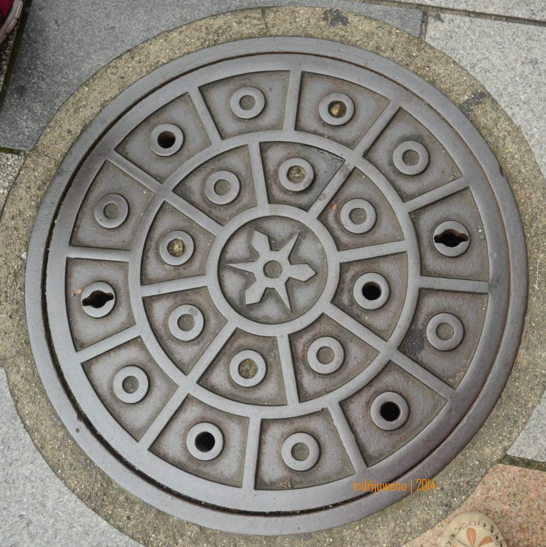 Jadi aku mengoleksi foto manhole cover (lubang untuk turun ke saluran bawah tanah) yang mudah ditemukan ketika berjalan kaki. Benda ini paling mudah ditemukan di trotoar. Bentuknya bundar dengan diameter sekitar 60 cm. Biasanya terbuat dari besi baja yang bergambar lambang-lambang yang berkaitan dengan kota. Ada yang berwarna, ataupun monokrom. Aku sendiri tidak tahu apakah di bawah sana ada berbagai macam fungsi untuk utilitas kota mengingat kota-kota di Jepang itu multi layer, tapi mengamati tutup di permukaan tanah ini sangat menarik.