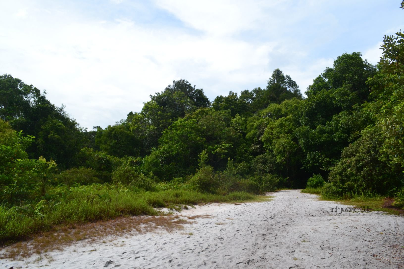 Sesudah melewati satu hutan dan menyeberangi jembatan, ternyata ada satu dataran terbuka yang berpasir putih di tengah hutan! Wah, pantas saja dari tadi jalan yang kami lalui walaupun agak becek ternyata berpasir putih juga di balik dedaunan kering yang jatuh. Aku sempat berhenti agak lama mengamati air hitam yang mengalir di bawah jembatan tadi. “Nanti kita akan lewat sungai yang airnya hitam seperti ini,” kata Ari. Wah, pasti menarik banget, nih!