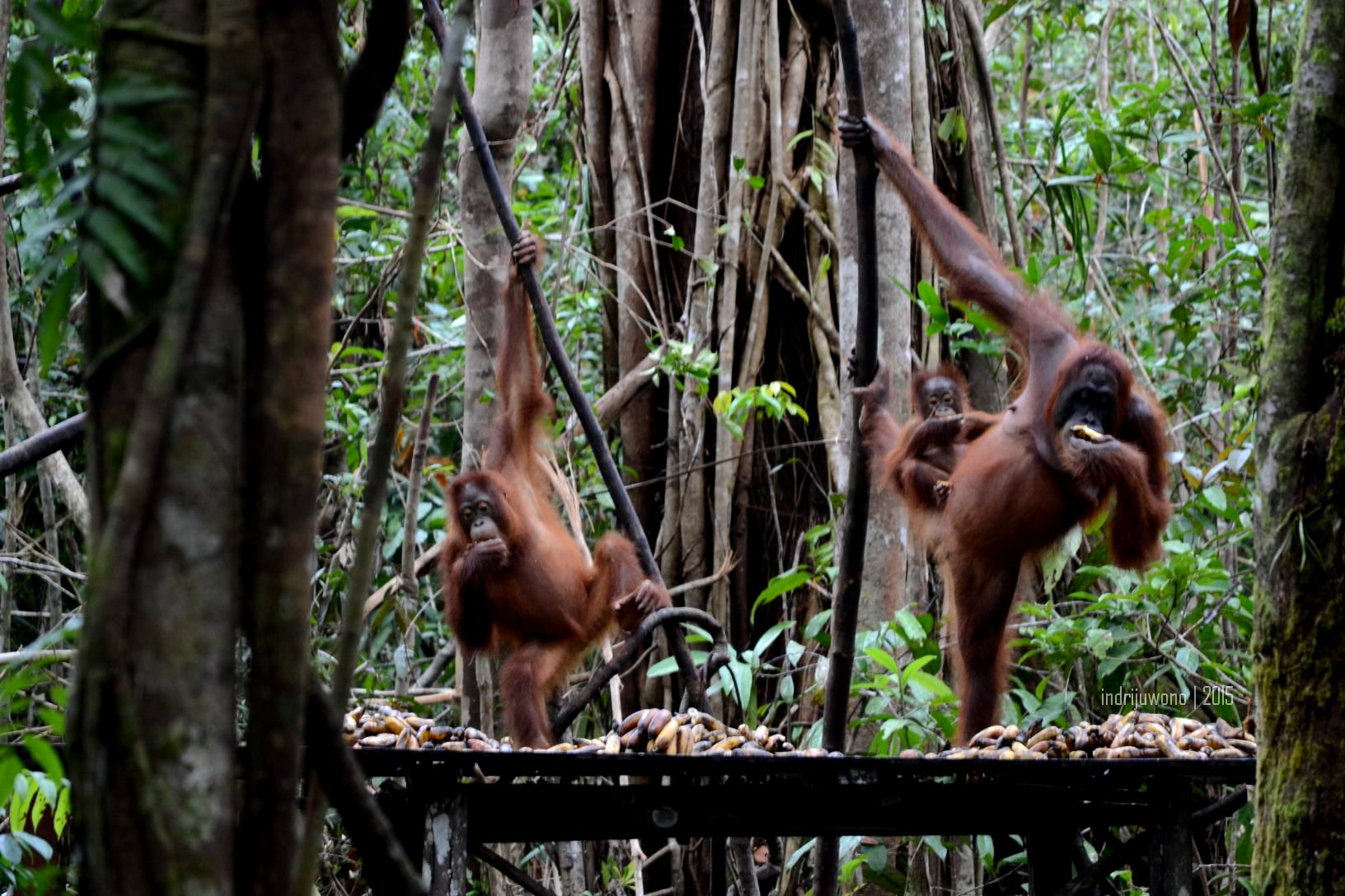 Sesudah kira-kira 20 menit berjalan kaki, kami tiba di dalam hutan hujan tropis yang pohonnya tinggi-tinggi sehingga sinar matahari hanya sedikit menembus hingga jalan setapak yang dipijak ini. Uh, rupanya nyamuk sudah mulai berkeliaran di sekeliling. Benar juga kata Indra, pakai lotion anti nyamuk sebelum masuk hutan. Sambil menghalau nyamuk mendekat, kami tiba di depan feeding ground, tempat orangutan itu akan ‘diberi makan’. “Ini sedang musim buah di hutan, jika musim kering lebih banyak lagi orangutan yang akan datang,” Ari menjelaskan.