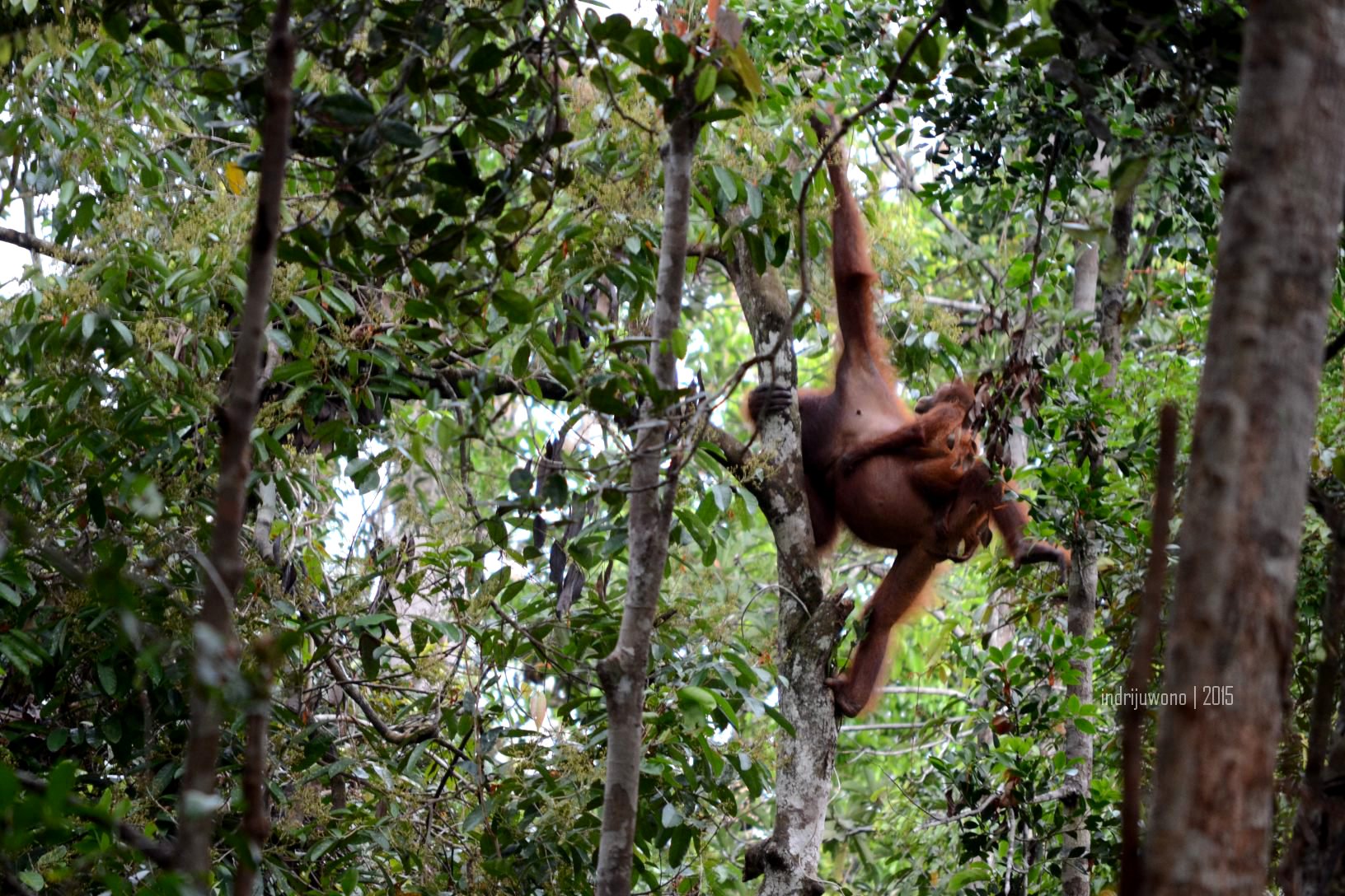 Lamat-lamat terlihat pepohonan bergoyang di kejauhan. Wih, apakah orangutannya mendekat? Kemresek! Tiba-tiba ada bayangan berkelebatan dan whaaa.. Seekor orangutan dewasa dan anaknya mendekat menuju feeding table dan menyambar buah pisang yang disediakan di situ. Anak orangutan itu menempel erat pada badan ibunya, takut jatuh dan terlepas, dan malu-malu. Matanya bulat melihat sekeliling.