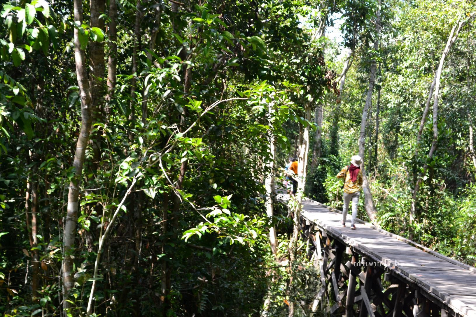 Apa sih yang dipikirkan Zarah Amala ketika ia melintasi jalur kayu di Camp Leakey ini? Pasti ia tidak berpikir apa-apa, masih menghitungnya sebagai pengalaman baru. Sepertiku, yang berjalan dengan santai, sambil menengok kaki-kaki kayu adakah orangutan di sana sedang bergelantungan?