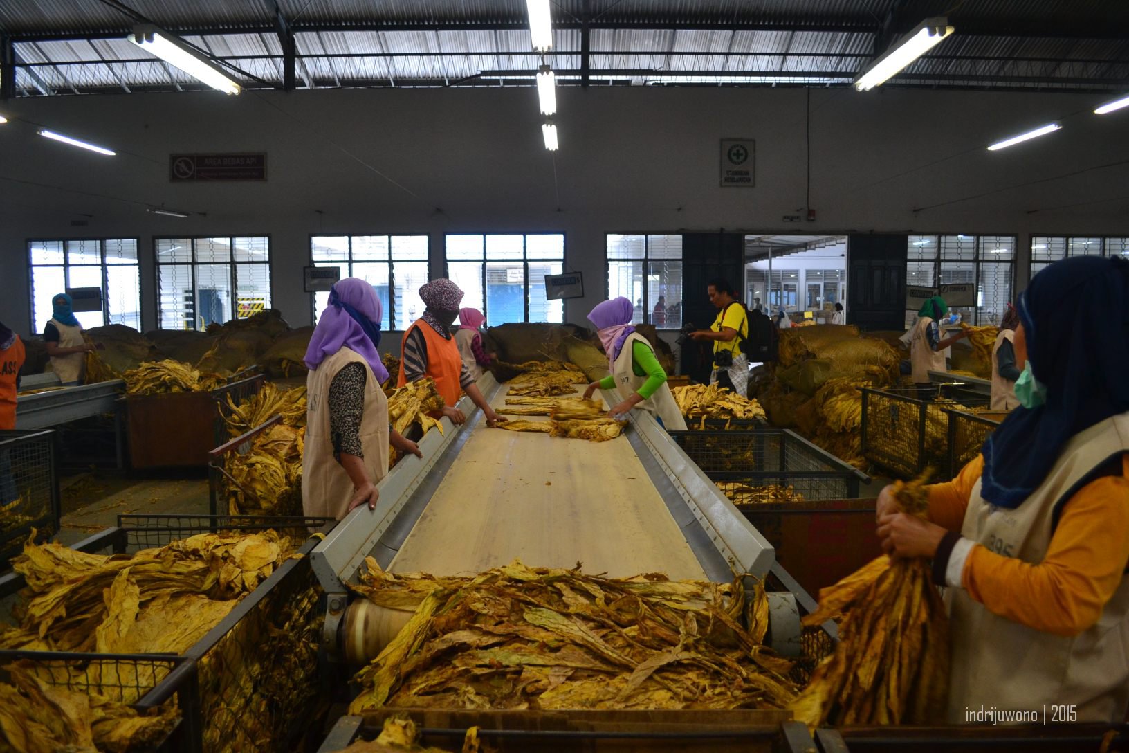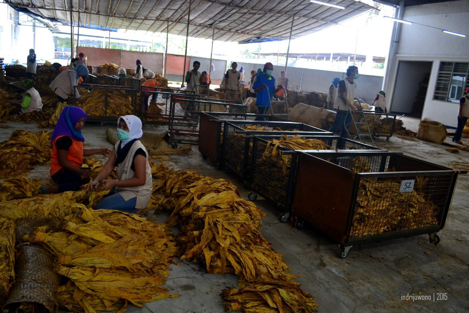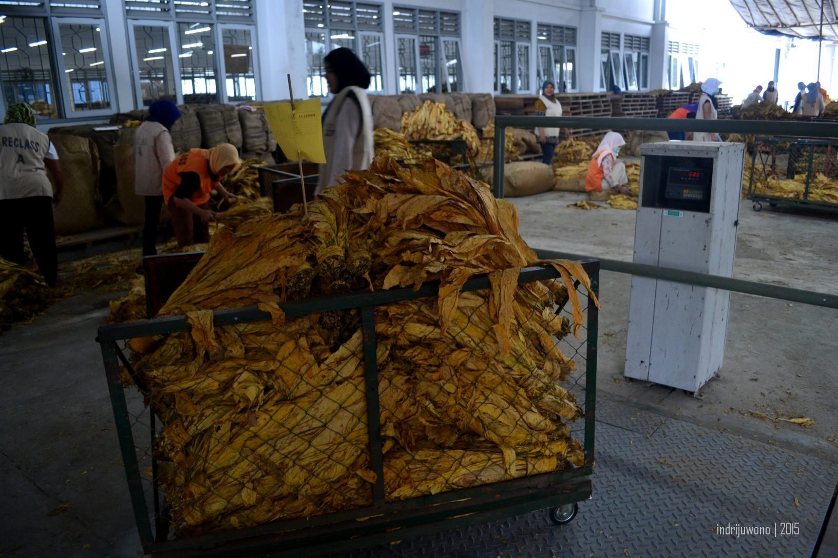 Daun tembakau kering yang tidak terbawa ke Kudus disortir lagi secara manual oleh pekerja-pekerja gudang untuk disalurkan pada industri yang sesuai kelas hasilnya nanti. Di tahap akhir, ada beberapa line conveyor tempat pekerja memeriksa kualitas daun tembakau, yeng kemudian diikat, dipadatkan, dipacking lagi dan disimpan menunggu waktu pengiriman. Wuih, panjang juga proses perjalanan tembakau ini.
