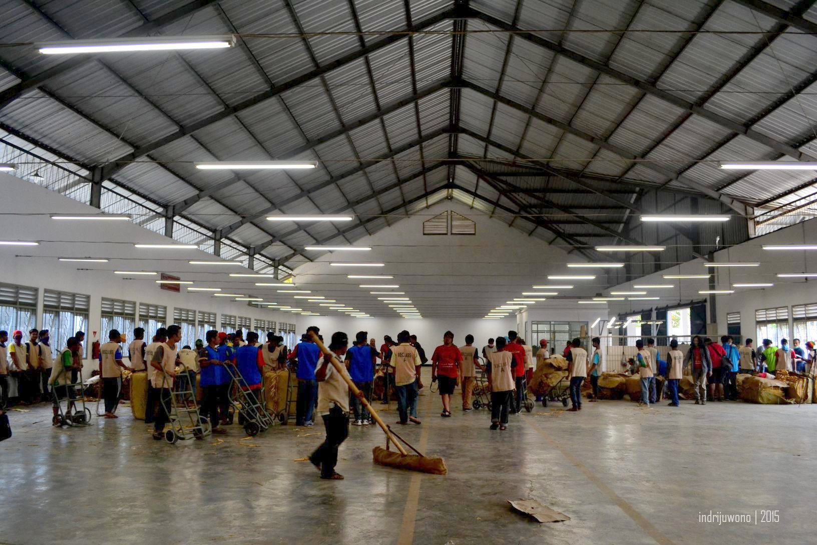 Begitu banyak tembakau yang berada dalam ruangan ini, sehingga aku merasa agak pusing karena baunya yang menguar kuat. Beberapa petugas mengenakan masker supaya mereka tidak mabok kepayang oleh baunya. Pantas saja meskipun tidak digunakan sampai ketinggian maksimal, gudang ini dibuat tinggi hingga 5 meter di titik terendahnya dan meninggi mengikuti kemiringan atap. Cahaya terang yang masuk melalui jendela-jendela memudahkan grader untuk melihat kualitas tembakau yang datang. Lantainya licin dengan floor hardener untuk memudahkan maintenance sehari-hari.