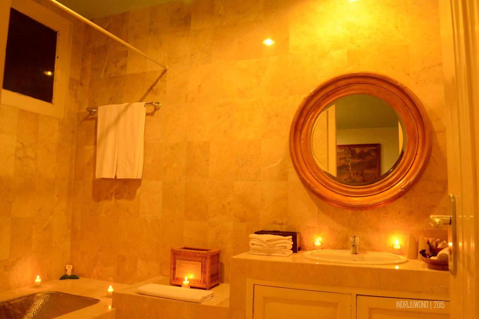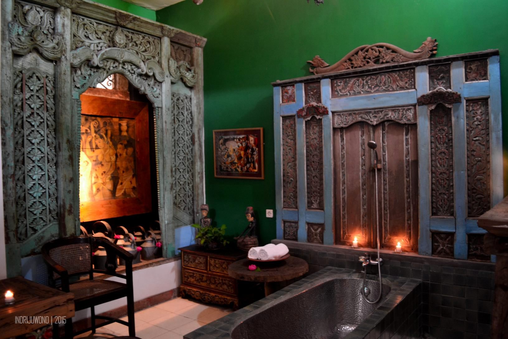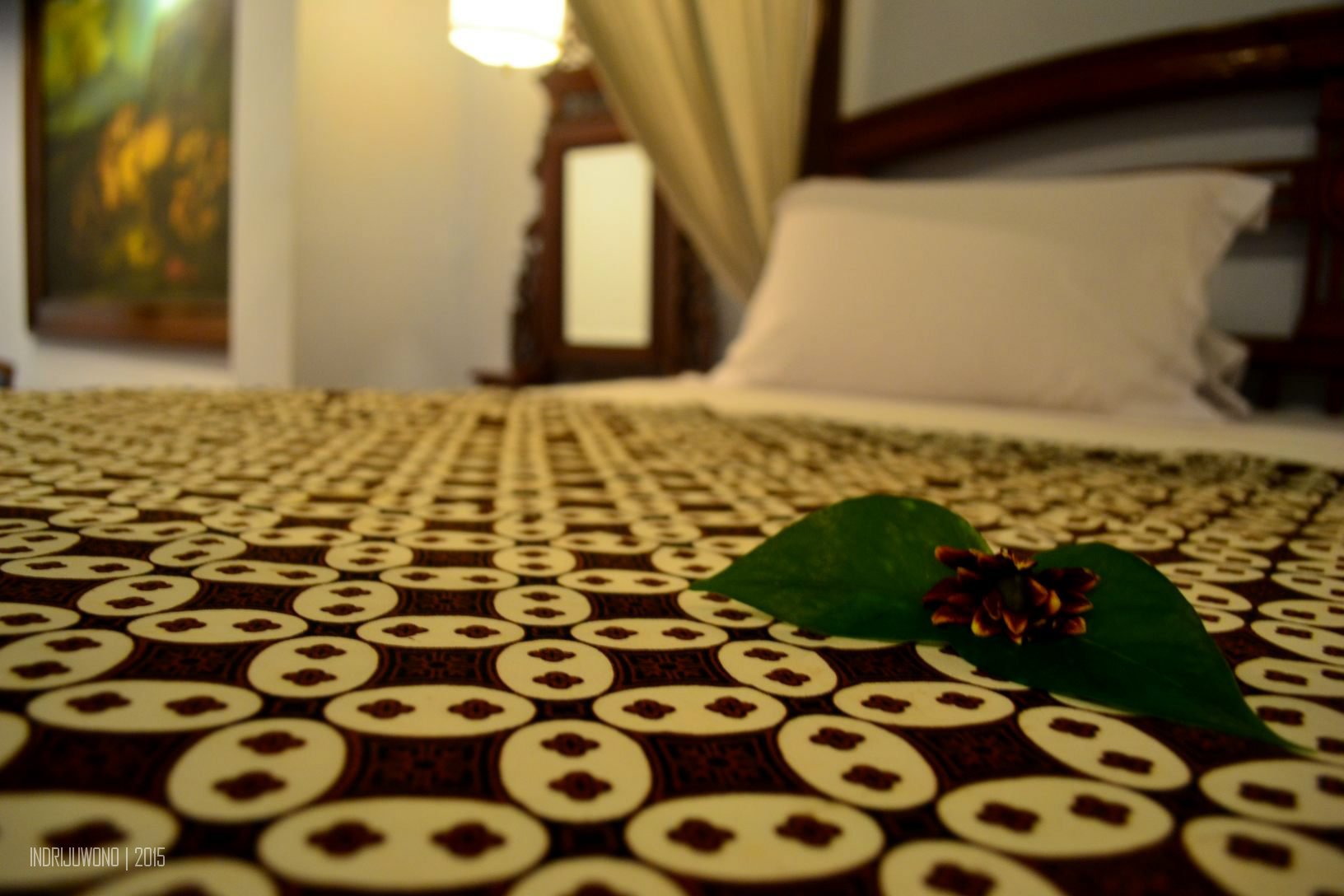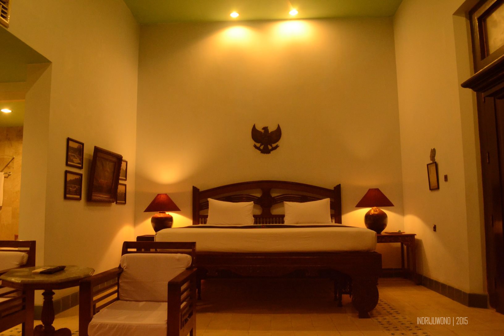 Yang mengejutkan adalah kamarnya, satu kamar ekslusif dengan tempat tidur yang benar-benar lapang, berukuran 2×2 meter dengan tiang-tiang dan tirai mengelilingi sekitar. Bahkan tempat tidur ini cukup tinggi sehingga perlu ambalan untuk naik ke atas tempat tidur. Ruangan yang membuatku merasa bagaikan puteri sehari itu, karena ditata dengan cantik dengan citarasa sederhana namun elegan. Tepat di samping tempat tidur terdapat dua meja rias untuk memacak diri, sementara di ujungnya ada sepasang kursi dan meja untuk sekadar minum teh di dalam kamar. Seperti di Tugu Malang, kamar mandinya juga tidak menggunakan bathub keramik melainkan tembaga kasar yang dikombinasikan dengan marmer.