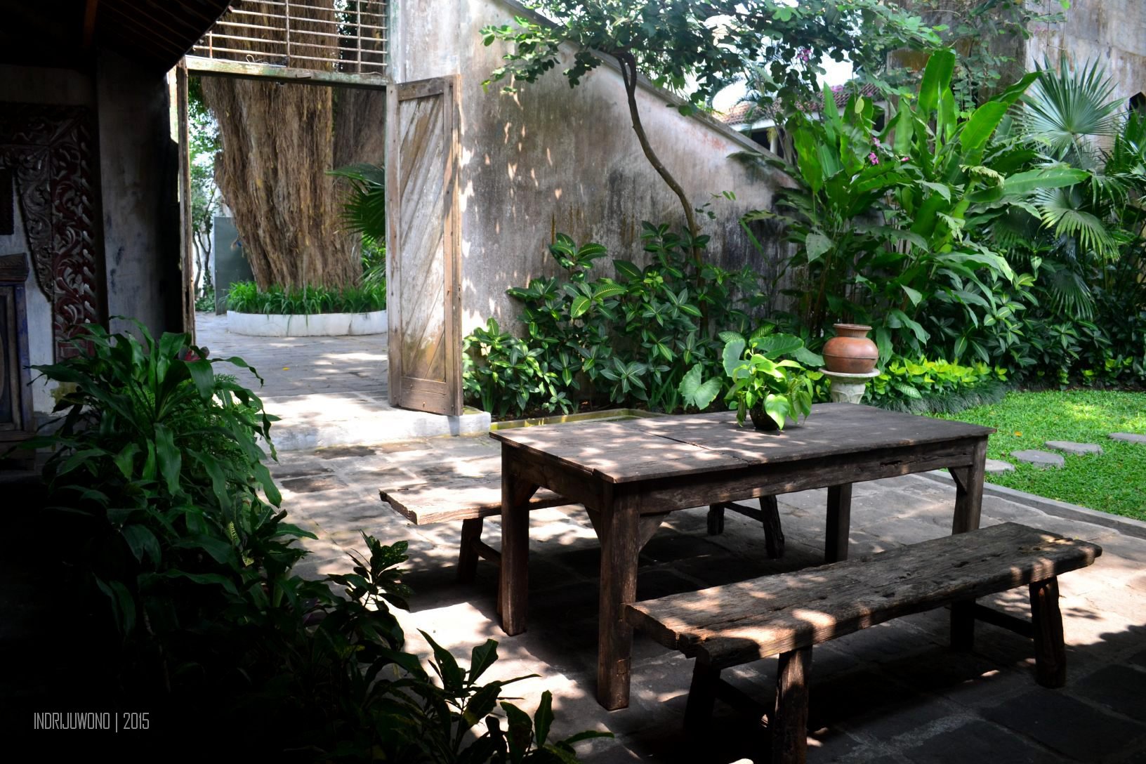 Sebelum ke bangunan utama, di sisi kiri terdapat satu ruangan berdinding lengkung tempat meletakkan gamelan yang dimainkan di sore hari dan sebelah kanannya bangunan kayu untuk coffee break di sore hari. Dinding lengkung ini bagian favoritku di sini karena benar-benar tempat berbelok sebelum memasuki area parkir. Lengkungnya begitu gemulai ditemani sulur-sulur beringin yang menggantung dipermainkan angin.
