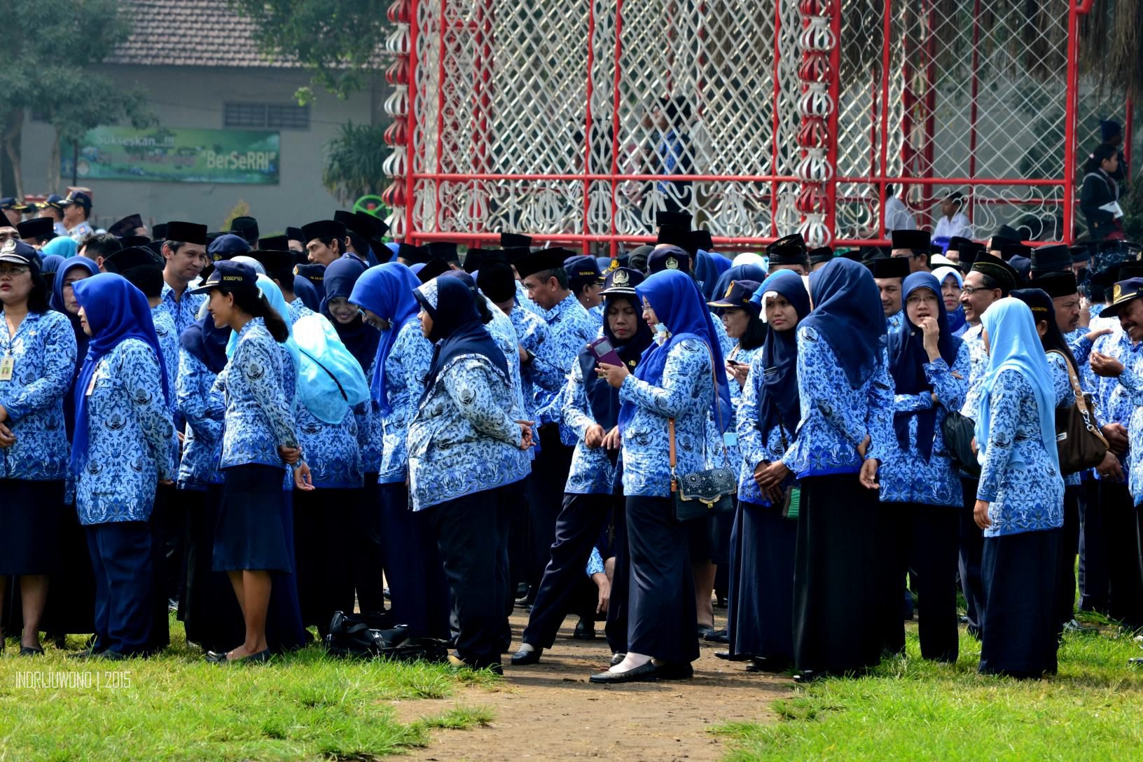 Orang dewasa berseragam Korpri menuju tempat kerjanya.