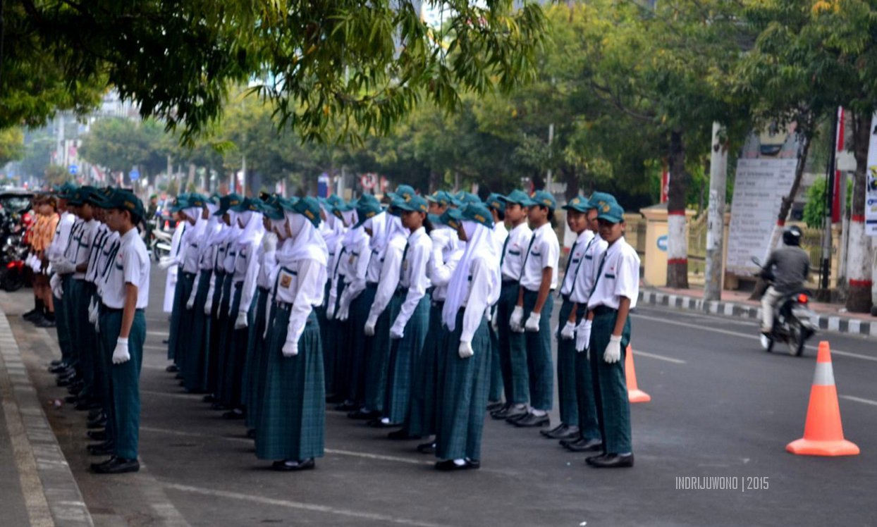 Anak SMP berkemeja rapi berbaris di depan sekolahnya.
