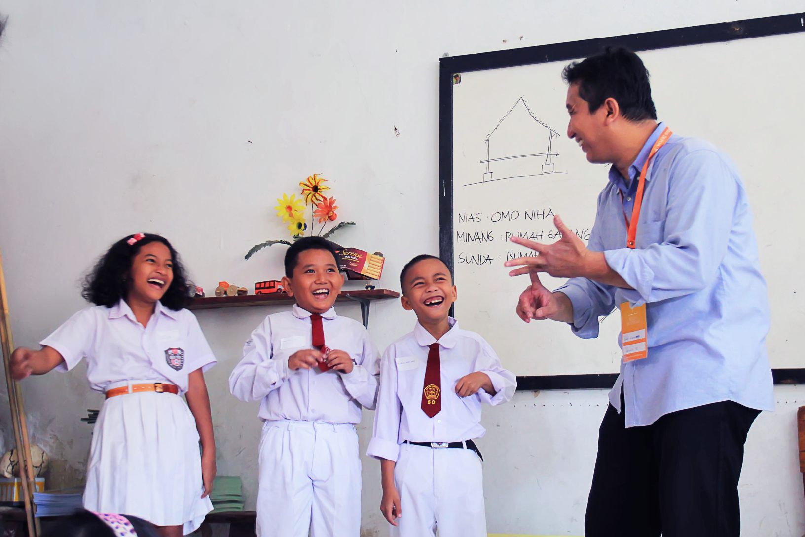 Sementara itu di kelas-kelas lain teman-teman asyik mengajar kelasnya dengan penuh semangat. Berbagai alat peraga dikeluarkan untuk menunjang kegiatan mereka. Tidak seperti kegiatan belajar mengajar biasa, kali ini lebih riuh dan bersemangat karena ditimpali dengan tebak-tebakan, nyanyian dan olah gerak yang membuat suasana lebih meriah. Kak Dea dengan model giginya, Kak Eddi mengajari latihan wawancara, Kak Irma memperlihatkan macam-macam burung, Kak Arwin dengan perangkat elektronika mini, dan kak Arie yang membawa teman orang Jepang asli untuk menemaninya mengajar, kak Diah dan poster-poster inspiratifnya. Sementara itu kak Ashari tetap mondar-mandir mengambil gambar video dan kak Joseph mengintip-intip lewat lensa kameranya. Kak Lilik, fasilitator kami siap membantu apabila ada kesulitan.