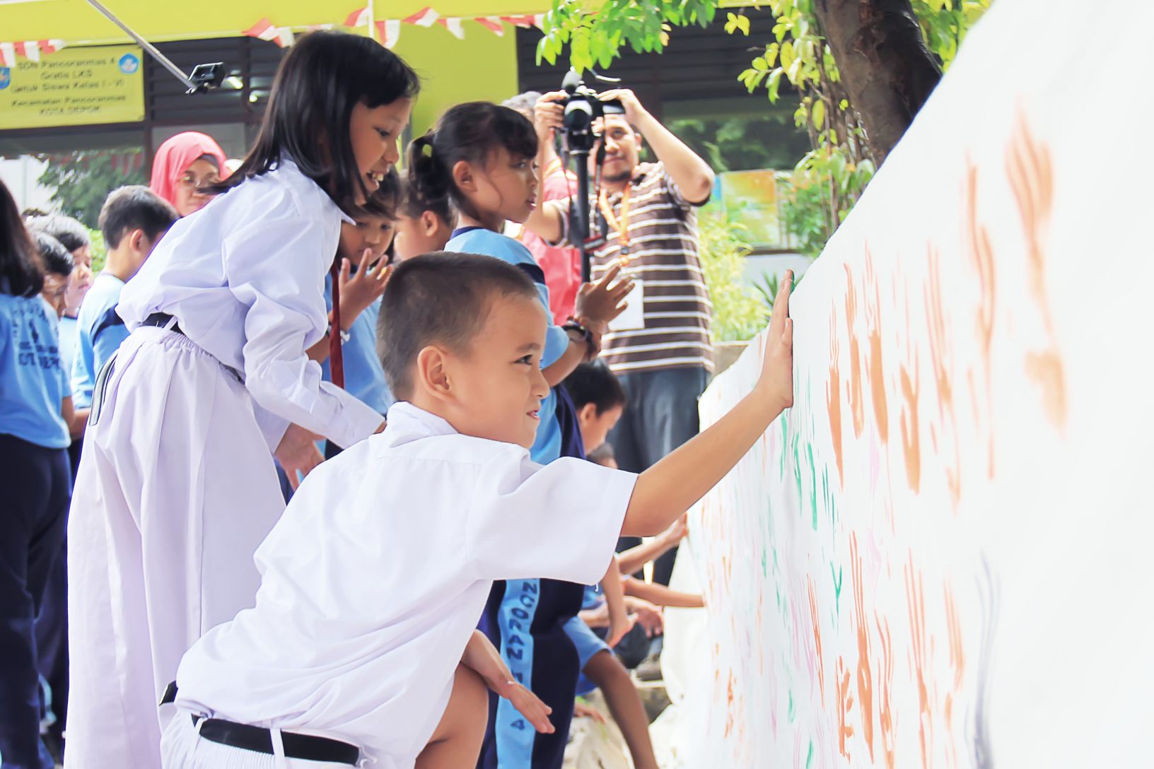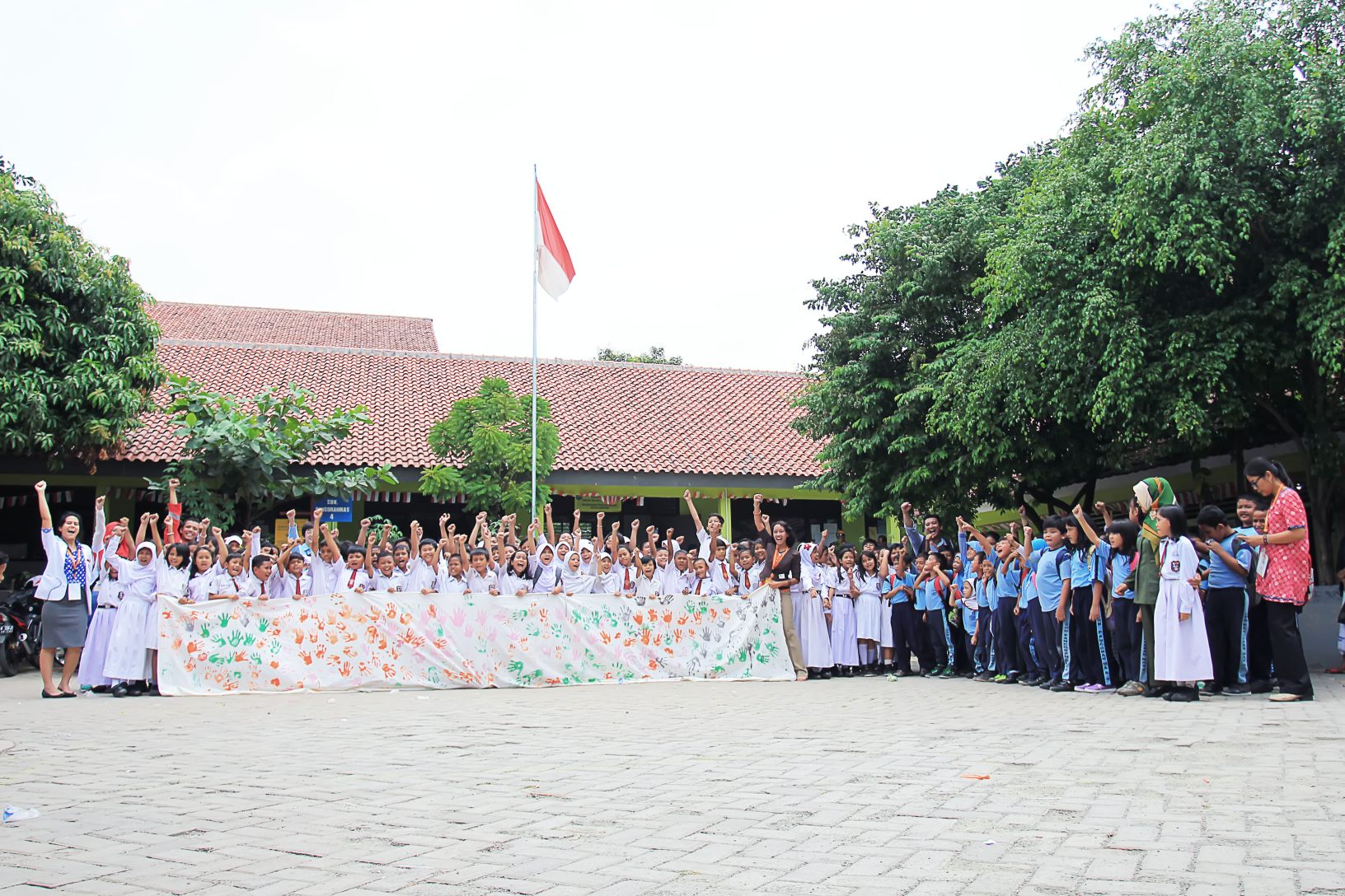 Hari itu ditutup dengan cap tangan di spanduk oleh anak-anak yang bersedia menerima sehari bersama kami, para guru yang berbagi profesi. Semoga cita-cita yang dituliskan dan ditempelkan menjadi motivasi yang kuat untuk membangun negeri.