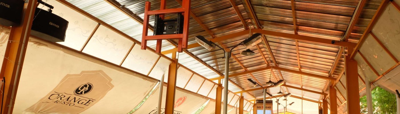“Orange Resto ini dirancang oleh anak Mesin, bukan Arsitek,” demikian canda bang Irfan Ferdiansyah, salah satu pemilik yang menemani sore itu. Memang sih, kelihatan sekali dari material industrial yang dominan di sini, gaya di sini agak terasa maskulin. Tidak seperti bangunan lainnya, area ini menumpuk container bekas sebagai bangunan-bangunan servis. Dari arah depan langsung tertangkap mata bentang portal container 40 feet, di atas container 20 feet yang difungsikan sebagai dapur minuman, dan berwarna oranye cerah mendominasi seperti langit senja.