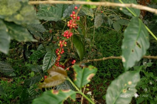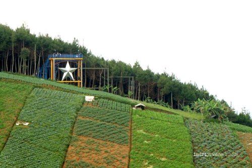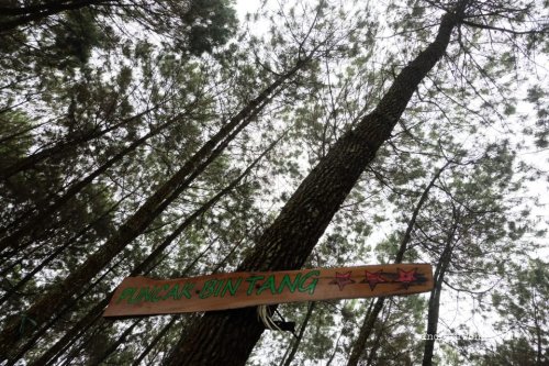 Di titik tertingginya juga terdapat sculpture bintang dalam ukuran besar, dengan bangku-bangku di depannya untuk bercengkrama. Menariknya di tepi-tepian jalan setapak dari pavingblock selebar 1,2 m itu aku menemukan tanaman kopi yang dengan buahnya yang bergerumbul. Entah mereka sudah berada di sana sejak masih hutan pinus bertahun yang lalu, atau sengaja ditanam oleh jagawana supaya menjadi daya tarik baru, mengingat kepopuleran olahan bijinya sebagai gaya hidup? Spesies yang hanya sebaris ini sekaligus menjadi batas antara jalur manusia dan hutan-hutan pinus.