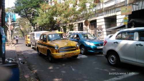 Sesudah menukarkan lembaran 100 dolar dengan 6100 rupee, kami keluar dari bandara dan langsung disambut oleh deretan taksi warna kuning. Wah, taksi ini lucu sekali, seperti yellow cab di New York rasanya. Karena kami sudah membeli tiket taksi seharga 280 rupee hingga Howrah Junction Station, jadi tak ada tawar-tawaran lagi, langsung naik ke taksi yang sudah berbaris rapi.