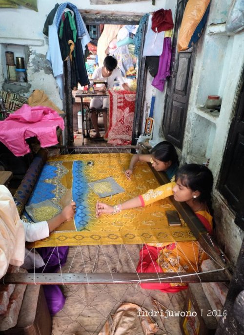 Tapi ternyata di sisi-sisi lain gang juga ditemui yang masih mengerjakan tenun dan motifnya dengan menggunakan tangan. Bahkan di sisi lain juga bisa ditemui membuat pelat cetakan untuk motif-motif saree yang akan dikerjakan. Melihat kami melongok dari jendela, mereka pun tersenyum manis sambil memamerkan senyumnya yang cerah.