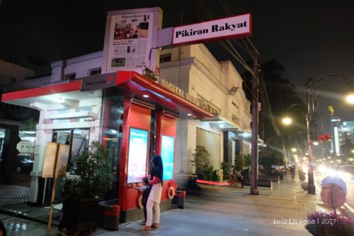 Butuh berapa lama untuk menyusuri jalan Asia Afrika sepanjang 650 meter ini? Dengan berbagai macam pengamatan menarik dan berfoto-foto, aku menghabiskan dua jam menyusurinya sambil berjalan kaki, duduk, makan eskrim, atau larut dalam keriuhan orang-orang yang malam mingguan di depan Gedung Merdeka dan duduk-duduk di alun-alun sambil beristirahat. Jalan yang selalu macet kalau dilalui dengan kendaraan bermotor ini selalu nyaman untuk dinikmati dalam lambat, apalagi di malam hari di tengah lampu-lampu mercury yang menerangi kecantikan berbagai bangunan peninggalan. Karena gedung-gedung itu sendiri adalah monumen, penanda waktu yang bercerita masa dengan sendirinya.