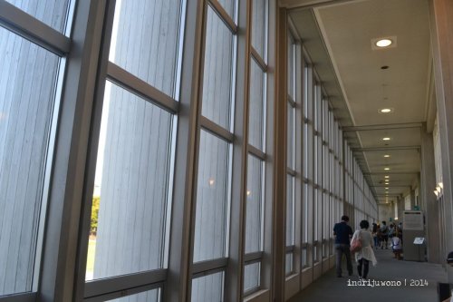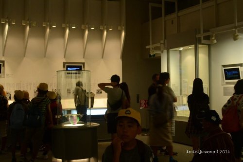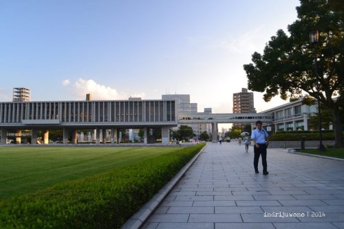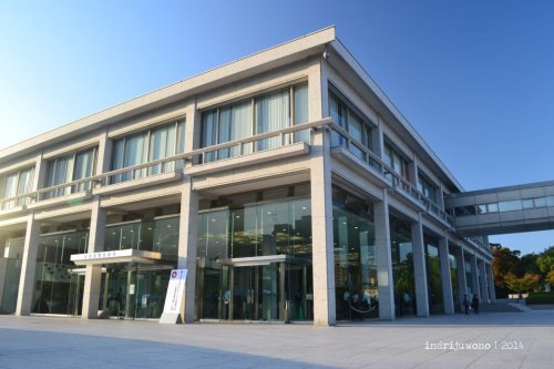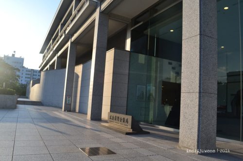 Setengah berlari, aku memasuki taman luas dan rindang di sekelilingnya itu untuk mencapai Hiroshima Peace Memorial Museum yang pasti segera tutup karena sudah sore. Bangunan ini memanjang melayang dari barat ke timur di atas tiang-tiang bulat dan menjadi focal interest dari keseluruhan taman. Seorang pemandu yang sedang menemani turis bule menunjukkan arah sayap timur ketika kutanyai di mana pintu masuknya. Segera aku menuju arah yang ditunjukkan untuk menikmati sejarah yang terjadi 72 tahun yang lalu itu.