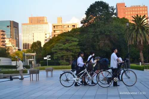 Ketika turun ke taman, hari sudah cukup sore sehingga aku banyak menjumpai orang-orang yang sedang beristirahat di taman. Seorang kakek asyik membaca koran di bangku batu, anak-anak sekolah pulang dengan sepedanya, sepasang muda mudi yang baru pulang kerja berjalan kaki melintasi taman. Ruang kota ini sangat hidup dan mudah dijangkau karena tidak ada pagar sama sekali di sekelilingnya. Orang bebas keluar masuk lewat dari satu sisi, melintasi taman dan keluar di sisi lainnya lagi. Taman ini menjalankan fungsinya sebagai ruang jeda dan ruang rekreasi.
