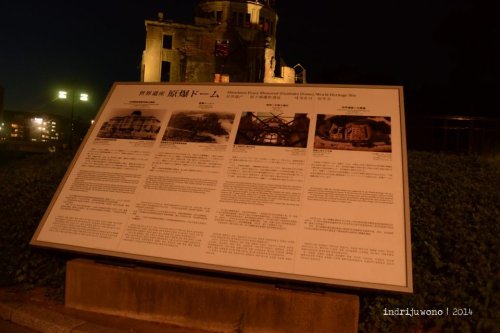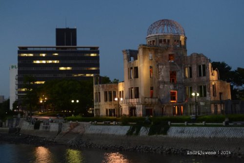 Karena bangunan Hiroshima National Peace Memorial Hall for the Atomic Bomb Victims sudah tutup, aku melanjutkan perjalanan kakiku ke tepi sungai Hiroshima sambil memandang ke seberang tempat Genbaku Dome-mae, gedung beratap kubah yang tetap berdiri ketika bom atom dijatuhkan itu mulai disinari lampu-lampu di sekitarnya. Senja mulai meremang ketika aku beristirahat di tepi sungai sambil memakan bekalku dan mengambil gambar bangunan yang bayangannya terpantul di sungai. Taman sudah mulai agak sepi hingga saat gelap benar-benar datang dan lampu taman menyala semuanya. Aku berjalan memutar ke seberang dan mendekati bangunan yang terdaftar sebagai UNESCO World Heritage Site itu.