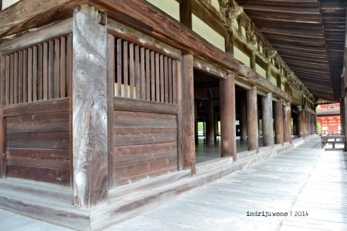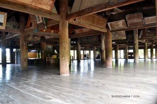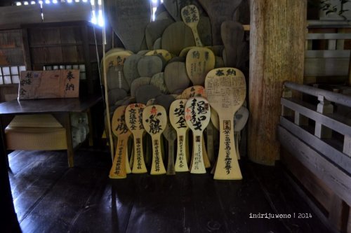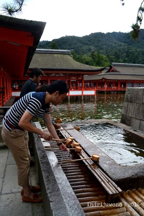 Sebelum masuk kuil orang-orang membasuh tangan dan muka mereka dengan air dan gayung kayu untuk mensucikan diri. Karena tertulis larangan untuk menggunakan tripod, maka aku urung mengeluarkan alat bantu potret itu. Mungkin karena kayu-kayu ini sudah cukup tua, atau barangkali aktivitasnya memotretnya akan mengganggu yang benar-benar beribadah.