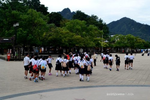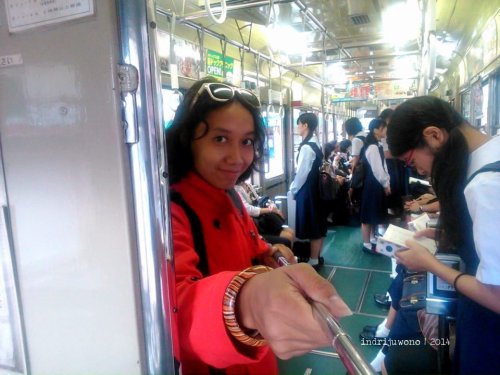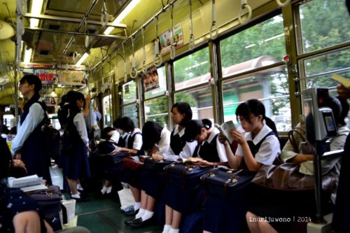 Pada jam 6 pagi ketika aku berangkat dari Dobashi, streetcar dipenuhi pelajar-pelajar Jepang yang memakai seragam pelaut dan berada di dalam kendaraan tanpa ribut-ribut. Mereka sepertinya cuek dengan sekeliling atau memang amat menjaga privasi. Tak satu pun yang berbisik-bisik heboh ketiika aku yang mengenakan coat merah terang, masuk di tengah pelajar-pelajar yang semuanya berbaju putih itu. Bahkan saat aku selfie sekali pun, mereka tetap tak peduli. Kebanyakan mereka juga turun di stasiun yang sama denganku, Hiroden-Nishi Hiroshima.