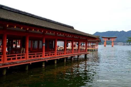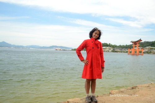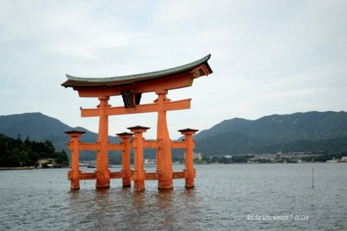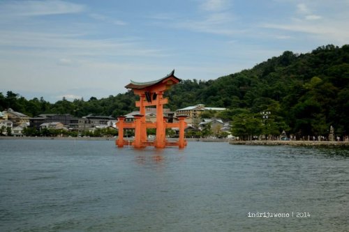 Angin laut menjelang musim gugur bertiup lumayan kencang menerpa wajahku ketika kapal mulai berlayar menuju pulau Miyajima. Tak lama kemudian mulai nampak O-torii gate di sebelah kanan. Torii besar gerbang laut ini adalah ikon pulau yang dianugerahi World Cultural Heritage oleh UNESCO ini. Tak heran, dari gambar-gambar yang sudah kulihat pun suasananya cantik berseri.