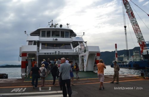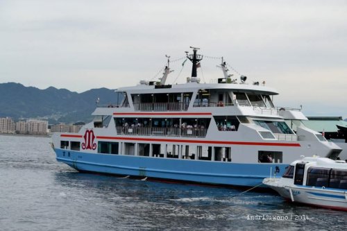 Pelabuhan Ferry menuju Miyajima berada tidak terlalu jauh dari stasiun Miyajima-Guchi. Kapal sudah bersandar di dermaga ketika aku tiba dan menunjukkan tiket JR Pass-ku pada petugas. Benar, tiket ini mencakup biaya ferry juga, makanya aku menyempatkan diri untuk datang ke pulau cantik ini. Karena masih pagi, kapalnya tidak terlalu penuh, lagipula memang diisi sesuai kapasitas saja.