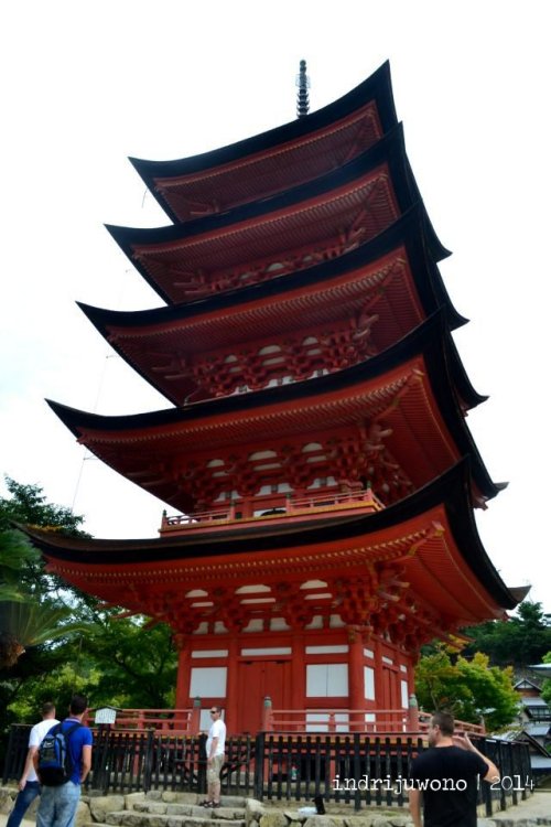 Aku mengurungkan niatku untuk berjalan lebih jauh lagi, dan memilih kembali melewati belakang Itsukushima Shrine menuju Five Storied Pagoda dan Toyokuni Shrines. Karena letaknya di atas, aku agak terengah-engah ketika menaiki tangga, mungkin karena sudah lelah juga berkeliling sejak tadi. Five Storied Pagoda dibangun tahun 1407 setinggi 28 m dan mengkombinasikan arsitektur Jepang dan Cina. Gambar-gambar Budha yang berwarna menghiasi keliling pagoda.