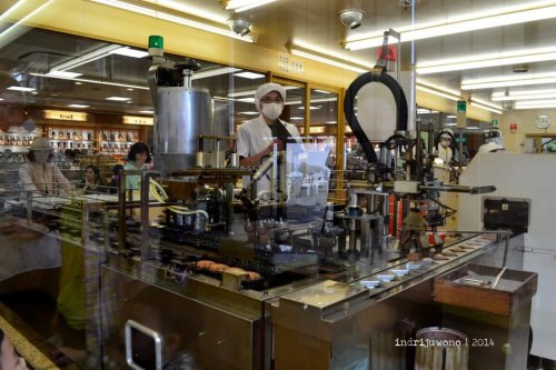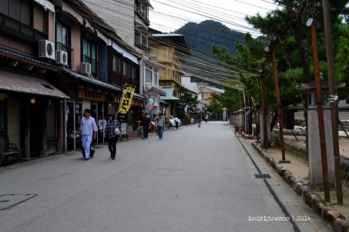 Aku melanjutkan langkah kaki masih di tepi laut untuk kembali menuju pelabuhan. Melalui sepanjang Omotesando Shopping Center, banyak sekali toko-toko yang menjual cinderamata serta kue khas Miyajima, yaitu kue Manju. Bahkan toko kue ini memamerkan mesin untuk mencetak kuenya dari sejak adonan hingga terpanggang. Kue manju yang berbentuk maple ini memang buah tangan yang ditunggu-tunggu dari Miyajima.