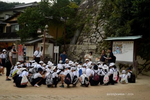 Tentu saja tujuan utamaku adalah melihat O-torii Gate dari jarak paling dekat. Semua jalur tepi laut ini diberi perkerasan untuk memudahkan berjalan kaki. Lucunya, aku juga menemukan murid-murid sekolah yang sedang piknik berbaris diatur oleh guru masing-masing. Ternyata Miyajima ini obyek studi wisata yang cukup ramai juga di kalangan anak sekolah. Aku berjalan terus hingga Mikasanohama dan memandang O-torii yang kakinya sudah tenggelam oleh air laut.