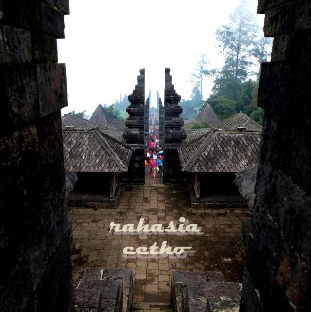 Dari teras Candi Cetho, mengintip bawah lewat gapura sempit, karena ada makna yang didapat ketika menaiki undakan itu satu demi satu, gapura demi gapura, titian andesit hingga akhir, candi utama yang dibungkus oleh bendera merah putih. Perlahan kerumunan itu akan datang untuk memuja sang Hyang. Upacara yang masih terus dijaga hingga kini.