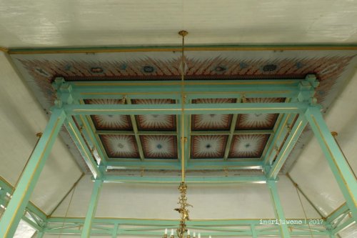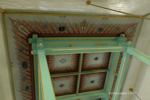 Pada langit-langit bagian atas soko guru ini dihias dengan batik Kumudowati yang bermotif lidah-lidah api berwarna merah untuk mencegah kejahatan. Terdapat delapan kotak yang membagi puncak soko guru ini yang bermakna berbeda-beda. Kuning bermakna mencegah rasa kantuk, biru mencegah datangnya musibah, hitam mencegah rasa lapar, hijau mencegah frustasi atau stress, putih mencegah pikiran kotor atau negatif, orange mencegah ketakutan, merah mencegah kejahatan dan ungu mencegah pikiran jahat.