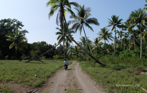 Meskipun sempat tersesat ke arah desa, namun kami mengandalkan insting bahwa laut pasti di arah barat dan meneruskan naik motor ke sana. Benar saja, tak lama tampak pohon-pohon kelapa yang menjulang dan biru laut di kejauhan. Ada satu bangunan yang mungkin sebelumnya penginapan, tapi nampak tak terawat lagi. Beberapa gazebo juga dibiarkan mangkrak di bawah pepohonan. Hm, mungkin tempat ini pernah direncanakan menjadi tempat wisata, namun kurang dipromosikan.
