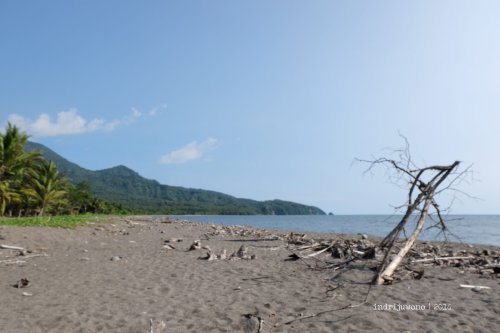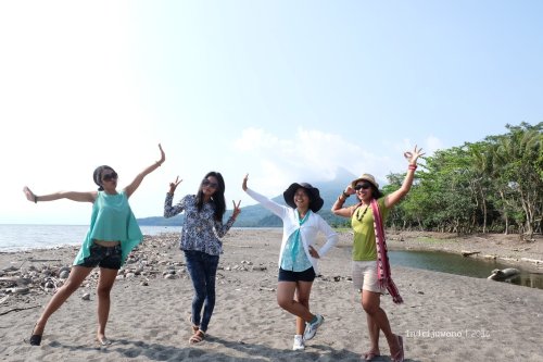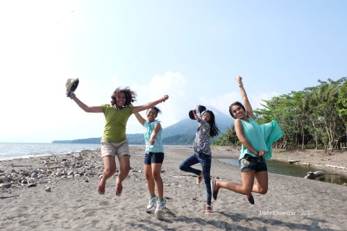 Pantai berpasir hitam ini menjadi tempat bermain terakhir kami hari itu. Kami bercipratan sambil menunggu matahari terbenam di sisi barat. Walaupun menikmati sunset itu bisa di mana saja, tapi setiap berakhirnya hari selalu menciptakan perasaan-perasaan sendiri yang berbeda, memberikan syukur atas apa yang dialami sepanjang hari. Matahari bisa tenggelam setiap hari, namun cerita yang menyertainya tidak pernah sama.