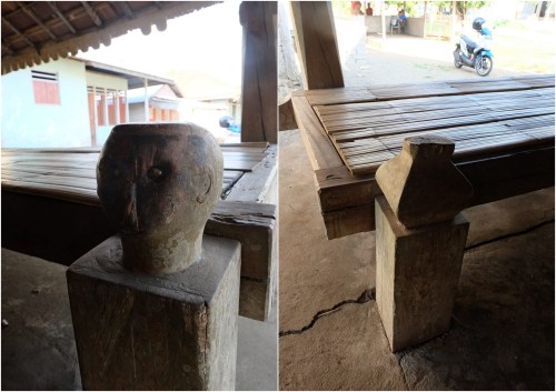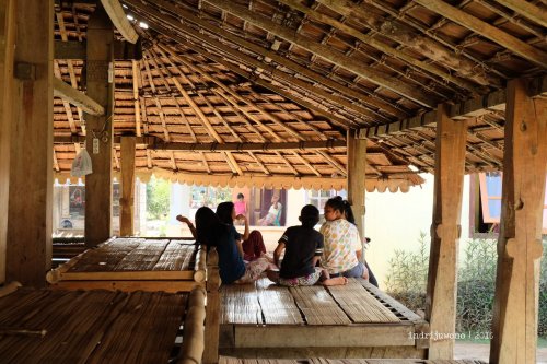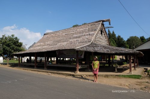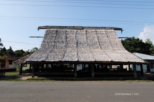 Aku tak melewatkan kesempatan untuk mampir rumah adat Jailolo yang bernama Sasadu dalam perjalanan pulang. Bertemu dua rumah di tepi jalan, dengan orang-orang tua yang asyik bercengkrama di dalamnya. “Ini balai untuk kami warga desa melakukan pertemuan di sini. Besok Kamis bisa kembali lagi ke sini karena ada festival Jailolo akan mengadakan acara makan-makan tradisional,” cerita bapak Frans di situ. “Makanan akan dihidangkan di meja panjang ini,” sambungnya sambil menunjukkan meja yang menyambung dari tiang ke tiang di bawah atapnya.