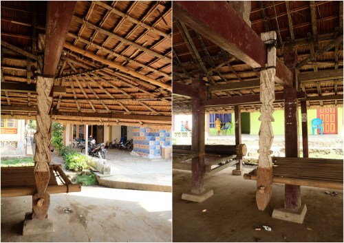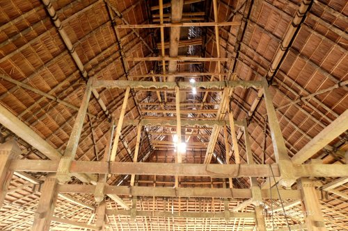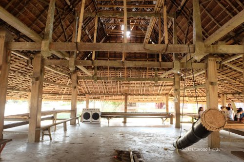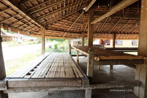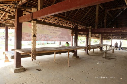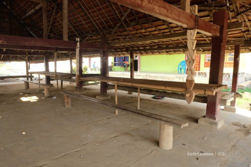 Di tengah-tengah ruangan terbuka ini tergantung kendang panjang yang biasa digunakan untuk upacara-upacara adat. Jika tidak digunakan, kendang ini kadang diturunkan dan diletakkan di bawah saja. Jika diperhatikan lebih jelas juga, terdapat berbagai ukiran unik di ujung meja dan kursi yang mengelilingi bangunan ini. “Sudah 100 tahun lebih ini umurnya, yang pernah dilakukan hanya mengganti atap dan meja-meja ini,” jelas bapak Frans lagi.