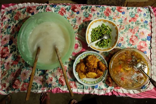 Papeda dan ikan kuah kuning sudah menunggu kami ketika kembali ke rumah. Bu Heni mengajari aku bagaimana cara mengambil papeda dari mangkuk dengan dua bilah kayu. Papeda ini berasal dari pohon sagu yang masih banyak terdapat di hutan-hutan Maluku, karenanya sebenarnya sagu masih merupakan bahan makanan pokok di sini. Hmm, lezat sekali papeda bercampur ikan kuah kuning yang aku tidak tahu bumbunya ini. Ditambah lagi dengan kehangatan keluarga Bu Heni dan Indah yang mengobrol menimpali cerita perjalanan hari itu, rasanya sempurnalah seharian di Jailolo ini.