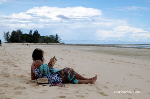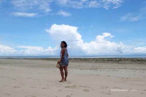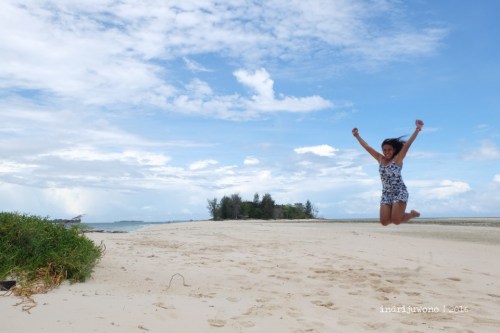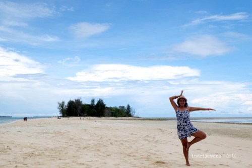 Singkat cerita, kami melakukan berbagai aktivitas di pasir yang putih itu mulai dari foto-foto, melamun, hingga membuat video sambil menari-nari. Nah, ketika melihat pemandangan sekeliling, barulah terasa ada yang aneh. Kalau tadi saat kami datang di sisi pulau sebelah timur lautnya cukup seru dan membuat kami deg-degan saking takut terhempas, di sisi lainnya pulau justru laut teduh. Pantai menyisakan berlapis-lapis pasir yang membentuk lansekap indah, angin pun hanya bertiup malas-malasan.