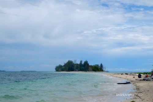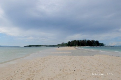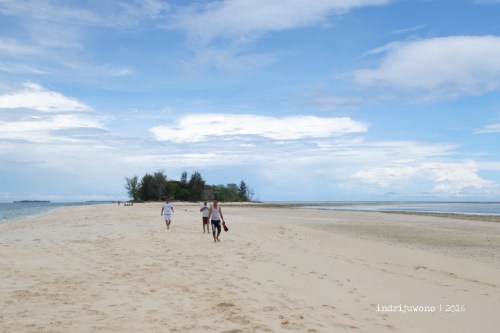 Yang paling unik dari pulau ini adalah adanya jalur pasir yang panjang kosong menuju sisi pulau sebelah selatan yang ditumbuhi hutan dan dikelilingi pasir juga. Berjalan di tengah pasir dengan kiri kanan laut seolah menyeberangi jembatan yang empuk tanpa takut jatuh tercebur. June dan Friandry juga menikmati perjalanan ini sambil banyak mengambil gambar. Kami memutuskan untuk berjalan hingga ujung selatan untuk menjumpai ujung pasir putih ini.