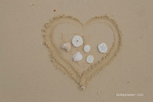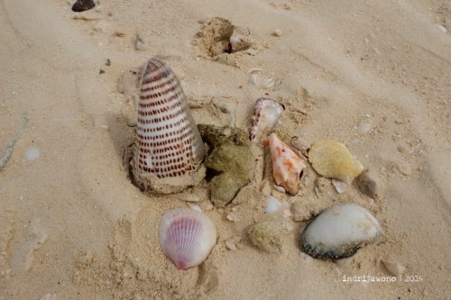 Melanjutkan perjalanan lewat sisi pantai yang sebelah barat, sesekali aku terhenti oleh batu-batu putih yang cantik yang menggoda untuk dibawa pulang. Kandungan kapur tipis membentuk bebatuan ini sehingga kuat sebagai cangkang. Entah apa yang pernah berada dalam rongga-rongga ini. Keasyikan bermain dengan batu, ternyata June dan Friandry sudah lebih jauh di depan hingga sisi utara pulau melewati pasir timbul yang sekarang mulai tenggelam.