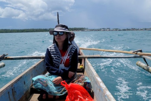 Walaupun hari sudah jam sebelas siang, tapi tak mengurungkan niat kami untuk berperahu ketinting dengan cadik kiri kanan. Sebenarnya agak ngeri-ngeri gimana gitu naik kapal yang panjang dan sempit itu berlima bersama tukang perahu dan anaknya, digoyang-goyang oleh laut Maluku Utara yang kedalamannya tidak kuketahui. Tapi berhubung aku cuek walaupun dengan kemampuan renang yang alakadarnya, tanpa memakai pelampung pula, maka hanya doa dan niat yang besar yang membawa kami akhirnya menuju Pulau Dodola.