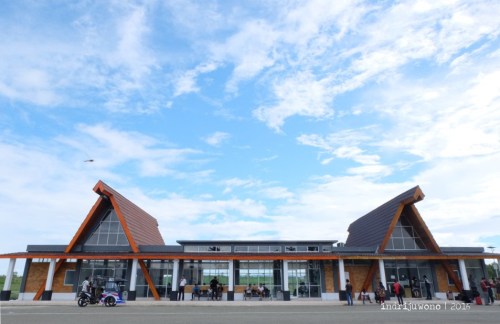 Aku, June dan Friandry naik bentor untuk mengantar mereka ke Bandara Pitu yang berjarak kira-kira 20 menit dari penginapan kami. Bayangkan, bisa naik bentor sampai pintu masuk bandara dengan arsitektur yang cantik yang menyesuaikan dengan ciri khas rumah adat Morotai. Sayangnya hanya mereka yang pulang karena aku masih ingin melewatkan sehari lagi di pulau ini, dan tidak bisa pulang naik pesawat. Kami sempat menemukan bekas baling-baling pesawat yang dijadikan tugu di tengah jalan.
