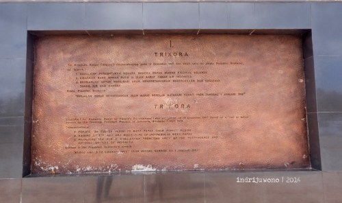 Kami juga mampir di Monumen Trikora dan museumnya yang indah, namun sayang tidak terawat. Tugu ini menghadap ke Papua, pulau yang diperjuangkan dalam Trikora tahun 1961. Pada sisi pertama tugu disebutkan Tri Komando Rakyat dari Presiden Soekarno beserta pidatonya: berjalan terus membebaskan Irian Barat sebelum matahari terbit 1 Januari 1963. Sisi-sisi lain dari tugu ini menggambarkan kondisi Morotai pada masa perang.