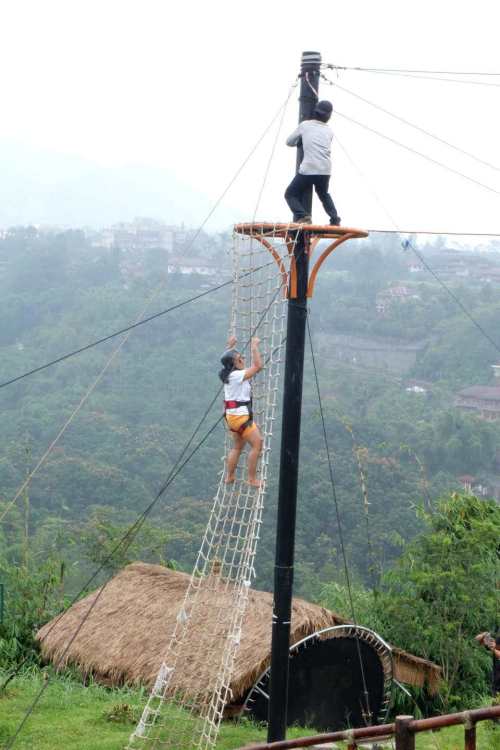 Untuk yang berani ketinggian, bisa mencoba highrope dan flying fox yang lokasinya tepat berada di depan tenda Svada kami. Menaiki tali hingga ketinggian ini juga membutuhkan energi yang cukup sehingga bisa mencapai ketinggian tempat start point permainan-permainan ini berada. Dan lucunya, walaupun di masa muda dulu aku termasuk yang jago tali temali dan bisa bolak balik SRT maupun rapelling, eh di Trizara malah jiper nggak bisa lanjut high rope karena badan sudah terlalu capek. Alhasil aku direscue dari satu titik karena nggak bisa melanjutkan. Yah, bagaimana lagi terjebak dan tak ada jalan lain selain melanjutkan, tapi kaki sudah lemes banget untuk melanjutkan meniti di sling yang membentang. Tapi mas-mas guiding High Rope-nya emang mantap dan baik hati sekali, dengan sabarnya membantuku turun dari ketinggian.