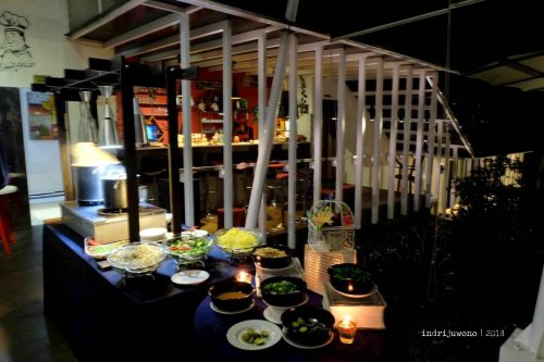 Tapi walaupun beratap tenda dan tidak ada dinding di sekelilingnya, aku tidak merasa kedinginan di Indriya Cafe ini. Entah karena memang sudah memakai jaket tebal sejak dari Svada atau karena canda tawa dan makanan yang tak henti menghangatkan badan ini. Di salah satu sudut memang ada live music untuk lebih menghidupkan suasana.