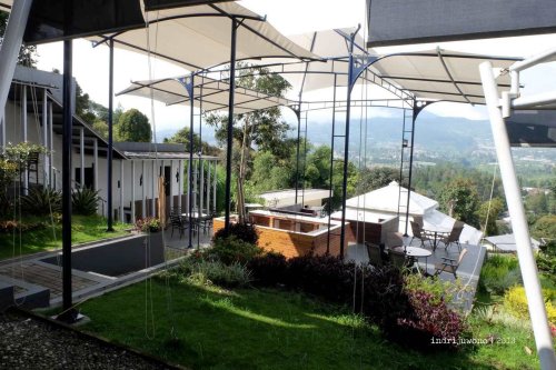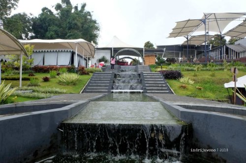 Bangunan pertama yang menggunakan tenda adalah lobby dan Indriya restaurant dengan bentang yang cukup lebar. Ditunjang dengan tiang-tiang besi bulat, tenda-tenda ini tetap kokoh saat hujan deras melanda. Yang unik adalah modifikasi dari tenda ini dengan sistem bertumpuk dan overlapping, sehingga menciptakan naungan untuk ruang duduk-duduk yang menghadap lembah yang cantik. Untuk alasnya pada bagian ini memang menggunakan cor beton, khusus pada bagian lobby ditutup dengan PVC wood polymer sehingga mengesankan kehangatan dari warna kayunya.
