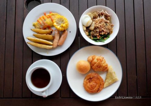 Blogger lain pasti hafal karena aku hobi makan dan bolak-balik ke meja hidang untuk mengambil segala jenis makanan dan ditata rapi di meja sebelum kuhabiskan perlahan-lahan. Ada satu yang menjadi favoritku ketika di sini aku menemukan bubur sumsum! Huwaah, kayaknya di hotel-hotel lain aku nggak pernah menemukan masakan tradisional ini, tapi di Trizara tersedia untuk sarapan (tentunya jika anda tiba pada waktu yang tepat).